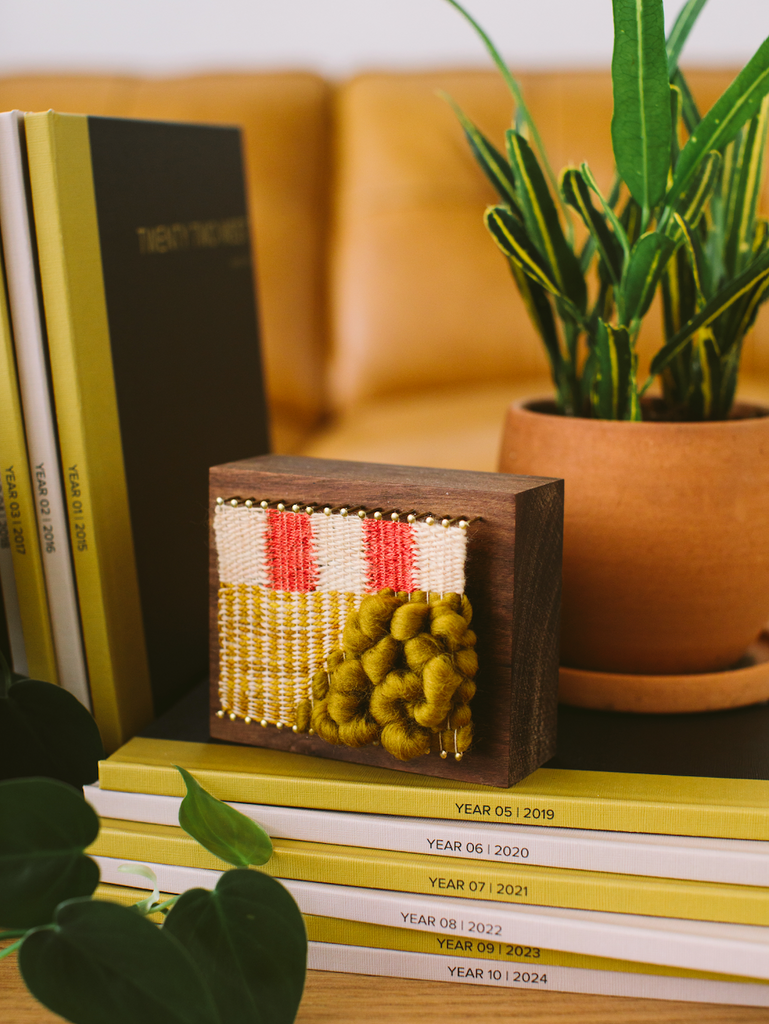 Built on a block of walnut wood, warped on brass nails, and finished with layers of natural fibers are woven through. We like to think that our Loom Blocks choose you, calling to the right home to add its gently textured charm. Whether you're looking for the perfect accent for a cozy nook, a subtle touch for your mantel, or something to elevate a bookshelf or side table, these pieces are a perfect fit. Their lightweight design also makes them ideal for hanging on a gallery wall, with included hardware for easy installation.