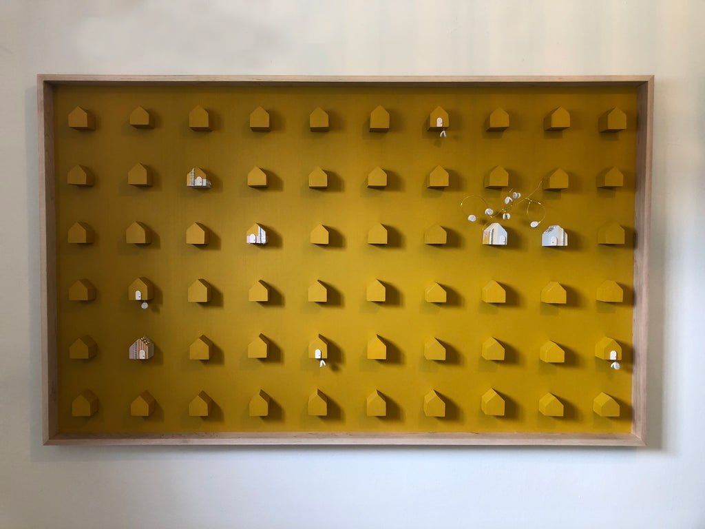 “Won’t You Be Our Neighbor” is all about welcoming you in through discovery and exploration. As it catches your eye throughout the day you will discover little details you hadn’t noticed before - an arched porcelain door, a charcoal line, a glint of gold wire, a striped butterfly. Just like the community we are all craving, this piece welcomes you to the neighborhood and is sure to create beautiful conversation around art, neighborliness, and creativity.